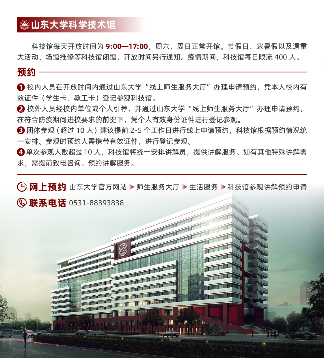 校内人员在开放时间内通过山东大学“线上师生服务大厅”办理申请预约,凭本人校内有效证件(学生卡、教工卡)登记参观科技馆。